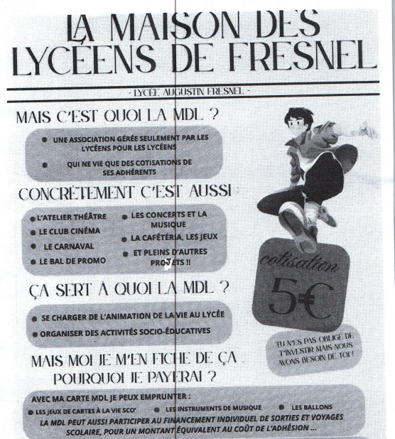 La Maison des Lycéens, c’est le pilier de l’engagement et de la créativité des élèves : un espace qui, selon M. Prime, CPE en charge de la MDL, « donne du sens à la vie au lycée et à l’association ». Au lycée Augustin Fresnel, tous les élèves peuvent y participer.