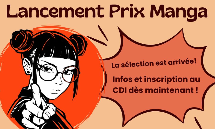 Depuis fin décembre, vous pouvez venir au CDI vous inscrire au Prix pour découvrir et emprunter la sélection. Nous vous donnerons alors un dossier qui vous servira de compte-rendu de lecture, afin de garder la trace de vos avis sur les différents mangas, bien pratique quand le moment de voter sera venu !