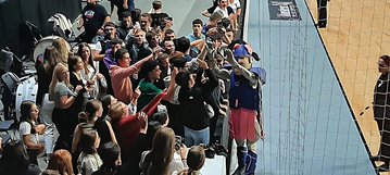 À la mi-temps, Cesson est en train de perdre, mais nous sommes encore motivés. La mascotte revient nous voir et demande à Jean-Didier si nous pouvons aller de l’autre côté de la salle, rejoindre un groupe de jeunes supporters qui chantent et ont un tambour. Jean-Didier accepte et nous voilà partis en courant, prêts à mettre l’ambiance.