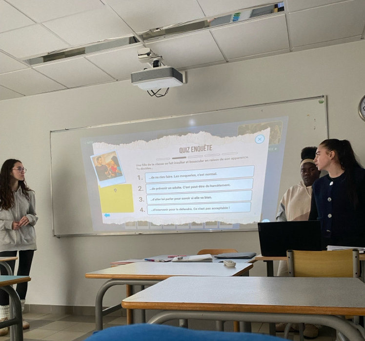 De retour au lycée, les élèves ont été repartis en plusieurs petits groupes encadrés par l'un de leur professeur afin de pouvoir donner leur ressenti sur le film . Les élèves de 1ère ont ensuite proposé un atelier escape game disponible sur la plateforme "Stop à la violence" (https://www.stoplaviolence.net/). Les collégiens ont pu se glisser dans la peau d'enquêteurs afin de comprendre les dessous du harcèlement scolaire dans des scénarios bien définis, comprendre la victime en cherchant ce que l'on ne voit pas, ce que l'on ne sait pas.