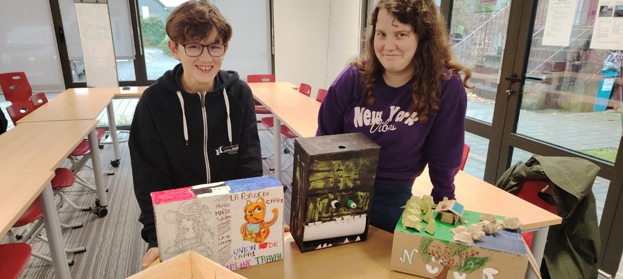 Ils les ont décorées pour qu'elles soient ludiques et voyantes dans la classe. La création de cette boite a donné lieu à une petite compétition avec des lots à gagner pour récompenser les boites les plus soignées et originales ! Ce sont les 3ème qui l'ont emporté avec leur boite monstre dévoreuse de papier !
