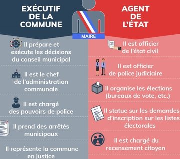 En effet, le maire est, pendant les 6 années de son mandat, le représentant de l’État au sein de la commune. Il représente une figure d’autorité en charge de maintenir l’ordre public ainsi que de veiller à la sécurité et à la tranquillité des habitants. C’est pour cela qu’il dirige la police municipale. De par son titre d'officier d'état civil, Il célèbre également les mariages et signe les actes de naissances et de décès. Il est le représentant direct du procureur de la République sur le territoire.