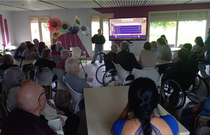 L’après-midi, nous avons partagé un moment très convivial autour de plusieurs activités ludiques que nous avions préparées en classe. Nous avons commencé par un Kahoot, où les résidents devaient répondre à des questions sur des objets de leur époque. On a ensuite réalisé un blind test musical où chacun essayait de reconnaître les chansons : titres, artistes.