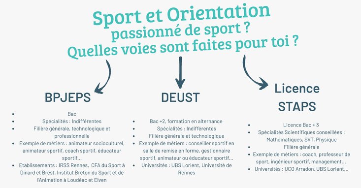 Passionné de sport vous aussi ? Il est facile d'hésiter parmi les différentes possibilités de poursuites d'études en lien avec le sport. L'affiche ci-dessous comporte des informations essentielles pour s'y retrouver entre BPJEPS, DEUST et licence STAPS.
