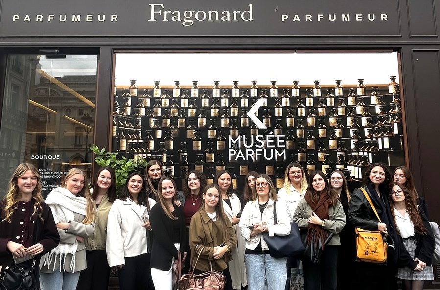 La matinée a débuté par la visite du musée du parfum Fragonard, lieu emblématique retraçant l’histoire du parfum de l’Antiquité à nos jours. Les étudiantes ont pu y découvrir les secrets de fabrication de la maison Fragonard ainsi qu’une collection exceptionnelle de flacons historiques et d’objets d’art liés à la parfumerie. Une expérience immersive qui a permis de mieux comprendre l’évolution de cet art au fil des siècles.
